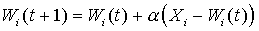 Темп обучения a имеет начальное значение масштаба 0.1 и постепенно уменьшается в процессе обучения. В процессе настройки нейрон учится усредненным обучающим векторам.