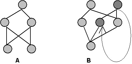 Рис. 8.1. Фрагменты сетей с прямым рапространением (A) и с наличием обратных связей (B).