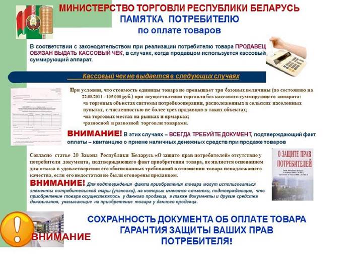 1. стоимость единицы товара не превышает три базовых величины (по состоянию на 28.11.2011 – 105 000 руб.) при осуществлении торговли без кассового суммирующего аппарата: