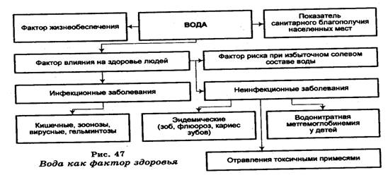 Вода является важнейшим фактором окружающей среды, который оказывает многообразное воздействие на все процессы жизнедеятельности организма, работоспособность и заболеваемость человека (рис. 47).