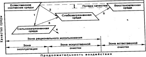 1 — нерациональное использование среды; 2 — рациональное использование среды; 3 — искусственное восстановление качества среды (искусственная очистка); 4 — деградация среды; 5— естественное восстановление качества среды (самоочищение, саморегуляция и др.).