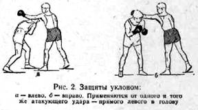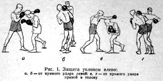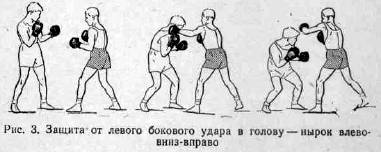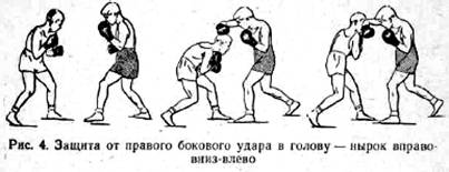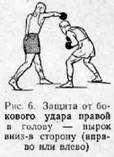 Точно так же на любой боковой удар совершенствовать одну защиту нырком вниз-в сторону. Не следует на каждый удар иметь «свою защиту», так как боксеру потребуется для этого еще определить, какой рукой будет нанесен удар (рис. 2, 3, 4, 5, 6).