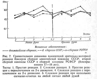 Сопоставление показателей сенсомоторной реакции боксеров разной квалификации (сборная олимпийская и вторая сборная СССР, 1963—1964 гг., сборная РСФСР-юноши 17—18 лет, 1963 г.) по всем вышеперечисленным тестам выявило интересную особенность: время простой реакции не коррелировалось с квалификацией боксеров (рис. 7).