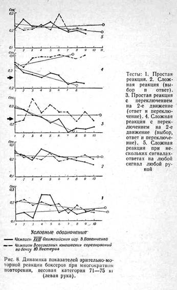 Данные исследований совпадали с данными педагогических наблюдений и в некоторой степени даже могли объяснить формирование у спортсменов индивидуальной манеры боксирования. Так, например, заслуженный мастер спорта В. Быстрое, имея весьма хорошие показатели (на этапе разносторонней физической подготовки): 0,17 сек.— простая реакция, 0,18 сек. — сложная реакция правой руки, 0,16 сек. — простая реакция, 0,18 сек.— сложная реакция левой руки в более сложных испытаниях (простая и сложная реакция с переключением на второе движение), имел посредственные показатели реакции (0,21—0,31 сек. левая рука и 0,23—0,32 сек. правая рука) и времени переключения на второе движение (0,14 сек.). На этапах специальной подготовки непосредственно к соревнованиям эти показатели значительно улучшились.