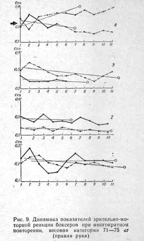 Анализ всех этих данных говорит о том, что ведущие боксеры-мастера имеют в отличие от остальных боксеров определенную стабильность показателей быстроты сен-сомоторной реакции и быстроты переключения при многократных повторениях (по всем пяти пробам на левую и правую руку), а в сложных реакциях выбора с переключением на другое движение — даже улучшение результатов по мере повторений (т. е. своеобразная психологическая настройка на работу).