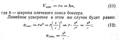 Угловая скорость меняется в ходе выполнения ударного движения, следовательно, меняется и линейная скорость движения ударной перчатки. Поэтому угловое ускорение вращательного движения тела боксера взаимосвязано с линейным ускорением ударной перчатки: a = E × r, линейное ускорение равно угловому ускорению, умноженному на радиус; угловое ускорение равно угловой скорости, деленной на время E = ω : t или линейному ускорению, деленному на радиус вращения E = a : r.