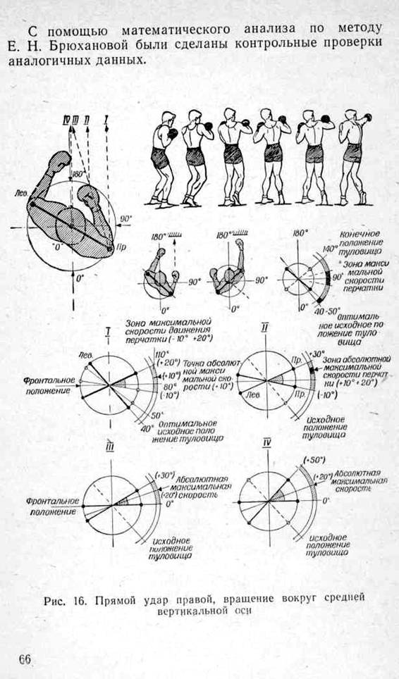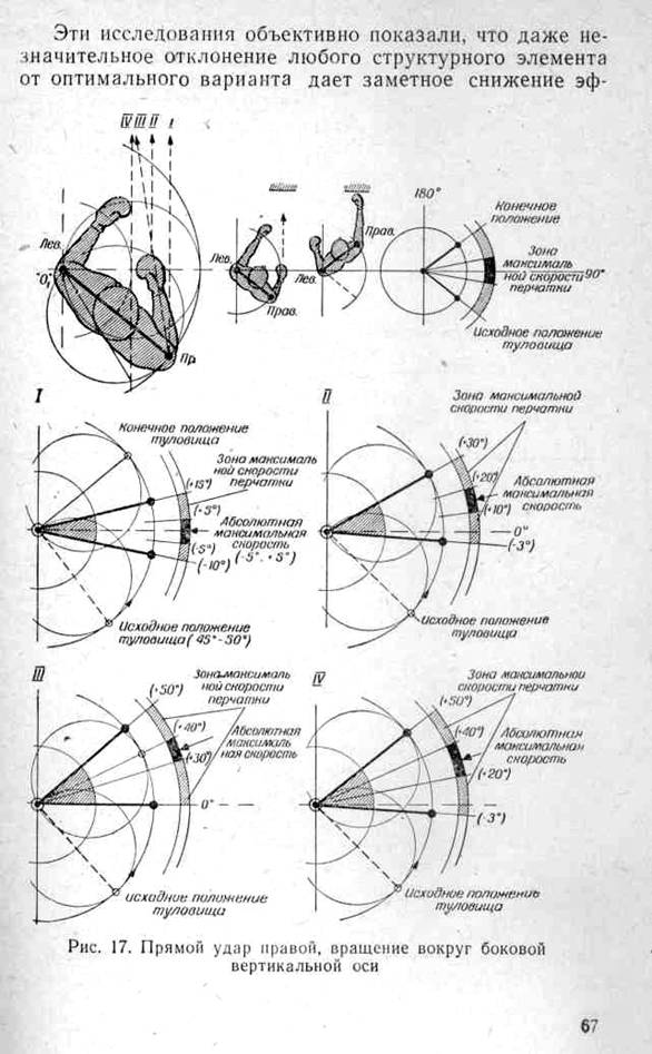 Нас интересуют наиболее рациональные сочетания величины радиуса вращения (т. е. расстояния от бьющей перчатки до вертикальной оси вращения туловища) и дистанции удара (ближняя, средняя, дальняя), создающие максимальную скорость в конечной фазе удара на цели. Метод графической циклограммометрии позволил достаточно точно выявить общие закономерности построения ударного движения боксера и помог правильнее оценить эффективность удара в различных вариантах.