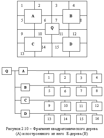 На рисунке 2.10 показан фрагмент двумерной области Q, на которой выделено 16 участков (квадрантов или пикселей), обозначенных цифрами. Вначале вся область разбивается на четыре квадранта: А, В, С и D, которые являются узлами дерева. Большой квадрант соответствует корневой вершине, самые мелкие квадранты соответствуют листьям. Проводится рекурсивное деление исходного изображения на квадранты до тех пор, пока все они не станут