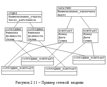 Сетевая модель данных определяется в тех же терминах, что иерархическая модель. Она состоит из множества записей, которые могут быть порождающими записями или порожденными. Связь между родительской записью и дочерней записью имеет вид «многие ко многим». Сетевые модели дают представление о предметной области в виде совокупности объектов, связанных отношениями типа «многие ко многим». Отличие от иерархических моделей в том, что каждый из объектов может иметь несколько «подчиненных» и несколько «старших» объектов.