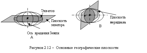- плоскость Земного экватора – плоскость, проходящая через центр Земли перпендикулярно к оси вращения (имеется только одна) (рис. 2.12, А);