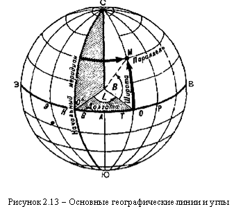 - меридиан – линия пересечения плоскостей географических меридианов с земной поверхностью, линия постоянной долготы (рис. 2.13);