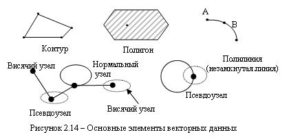 Рассмотрим особенности, присущие основным элементам векторных данных ГИС.