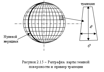 Топографические карты составляются по результатам съемок территорий и отличаются детальностью изображения местности. Это, как правило, многолистовые карты. На них криволинейная часть земной поверхности отображается в криволинейную часть трапеции, поэтому отдельные листы таких карт называют трапециями (рис. 2.15). Сложив по определенному правилу все трапеции, можно получить карту всего Земного шара.