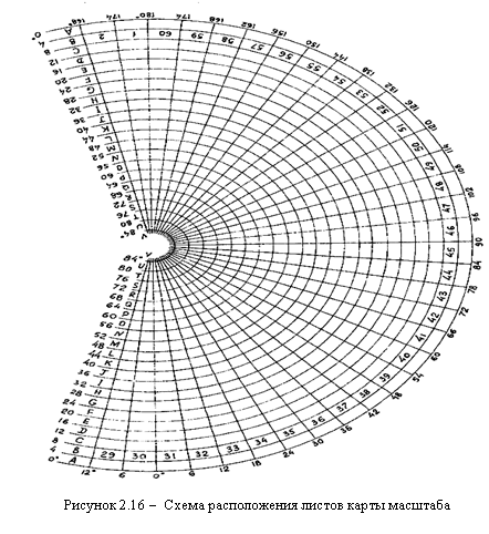 Листы масштаба 1:формируют также из карты миллионного масштаба. Трапецию делят на 9 частей (показано на рис. 2.17 пунктиром). Каждая 1/9 часть листа карты представляется в масштабе 1: и обозначается римскими цифрами 1-1Х, расположенными перед номенклатурой карты миллионного масштаба, например, 1-N–37.