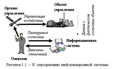 Любая информационная система создается для управления конкретным объектом (предприятием, станком, человеком и др.). В соответствии с общей теорией управления, процесс управления можно представить как взаимодействие двух систем: объекта управления и системы управления. Система управления функционирует на базе информации о состоянии объекта, его входов (например, материальные, трудовые, людские ресурсы) и выходов (например, выпускаемая продукция, финансовые результаты) в соответствии с поставленной целью (например, максимум продукции при минимуме затрат). Управление заключается в выявлении расхождения желаемых характеристик функционирования объекта от реальных показателей и через органы управления формирование такого воздействия на объект, которое это расхождение устремит к минимуму. Управляющее воздействие осуществляется с учетом обратной связи, т. е. текущей информации об объекте и характеристик внешней среды (рынка и вышестоящих организаций). Внедрение информационной системы производится с целью повышения эффективности деятельности объекта за счет принципиально новых методов управления.