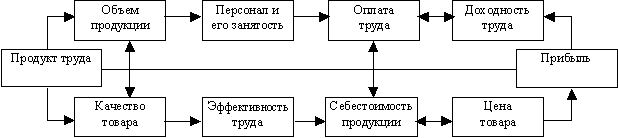 Способность предприятия в условиях рынка обеспечить устойчивое получение прибыли на основе высокой доходности труда персонала характеризуют факторы экономической результативности труда, которые могут быть сведены в три группы. К первой группе относятся факторы, характеризующие продукт труда (объем и качество производимых товаров, работ и услуг), ко второй группе - факторы, характеризующие количественный и качественный состав персонала, степень его занятости и уровень оплаты труда; третья группа факторов характеризует структуру и уровень затрат, образующих себестоимость продукции (работ и услуг), в сопоставленными с уровнем рыночных цен. Системный анализ всех этих факторов в их взаимосвязи должен служить основой формирования механизма повышения уровня экономических результатов совокупного труда предприятия как это показано на рис.26.