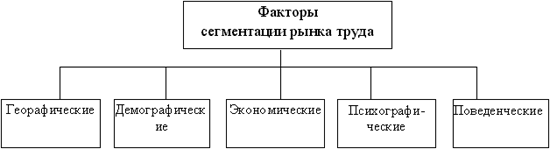 Однако для характеристики сегмента недостаточно информации только о его критериях. Например, формирование спроса и предложения рабочей силы происходит как в отраслевом, так и в территориальном разрезах. Принимая во внимание особенности отраслевой и территориальной динамики соответствия спроса и предложения, можно выработать методы регулятивного характера, направленные на уменьшение их дисбаланса. Поэтому выбор сегментов осуществляется не только по критериям, но и по признака (факторам): географическим, демографическим, экономическим, психографическим, поведенческим.