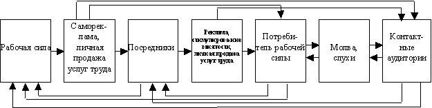 - реклама - любая форма наличного представления и продвижения идей, товаров и услуг, оплачиваемая точно установленным заказчиком (определение Американской маркетинговой ассоциации); стимулирование сбыта - кратковременные побудительные меры поощрения покупки или продажи товара или услуги; формирование благоприятного общественного мнения о фирме, учреждении или его продукции; личные контакты, продажи - устное представление товара в ходе беседы с одним или несколькими потенциальными покупателями с целью последующей продажи. В связи с тем, что продавая свою рабочую силу работник лично присутствует при найме на работу и старается, как правило, сформировать о себе благоприятное мнение, то эти два аспекта коммуникаций всегда имеют место при трудоустройстве не зависимо от его способа.