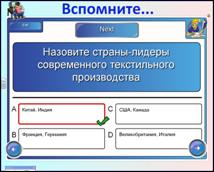 | Повторение основных знаний, полученных на предыдущем уроке. Учитель предлагает вспомнить основные термины и определения прошлого урока. На нем представлен тест созданный в программе Notebook 10, при помощи средств интерактивной доски SMART Board. Задания в тесте полностью соответствуют уровню знаний и текстовому материалу предыдущих параграфов в теме «Промышленность». | Оценка ребенку, находящемуся у доски, выставляется автоматически, специальной программой. По ходу выполнения теста могут быть заданы дополнительные вопросы, позволяющие расширить проверяемый объем и уровень знаний. Учащиеся в классе выполняют задание параллельно, в своих тетрадях. |