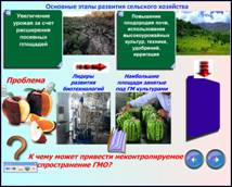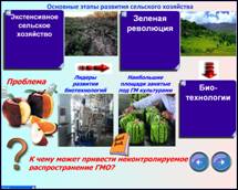 Разумеется, уровень товарности определяет уровень интенсивности производства. Перед вами основные этапы развития мирового сельского хозяйства: от экстенсивного к «зеленой» революции и биотехнологиям. Одной из главных проблем экстенсивного сельского хозяйства стала система подсечно-огневого земледелия в тропических странах. В лесу рубили деревья или подсекали их, подрезали кору, чтобы они высохли. Через год лес сжигали и производили посев прямо в золу, выступающую хорошим удобрением. Последствия — обезлесение и опустынивание, особенно в Африке. «Зеленая» революция, это комплекс изменений в сельском хозяйстве развивающихся стран, имевших место в 1950-х — 1970-х годах и приведших к значительному увеличению мировой сельскохозяйственной продукции. Включал в себя активное выведение более продуктивных сортов растений, расширение ирригации, применения удобрений, пестицидов, современной техники. В современном сельском хозяйстве широко применяются биотехнологии, которые позволяют решить многие проблемы человечества, такие как проблему голода, нехватки продовольствия, ресурсов, энергии, экологическую проблему. С помощью современных методов традиционные биотехнологические производства получили возможность улучшить качество пищевых продуктов и увеличить продуктивность живых организмов. Биотехнологии подразумевают также широкое внедрение ГМ культур. Наибольшие площади, занятые под ГМ культурами в США, Канаде, Австралии, Аргентине, Мексике, ЮАР, Франции. Ну, а лидеры развития биотехнологий - США, Япония, Германия, Франция. Дальнейший прогресс человечества во многом связан с развитием биотехнологий, но давайте подумаем: К чему может привести неконтролируемое распространение ГМО? | |||