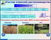 | Учитель объявляет состав отраслей растениеводства (стр. 154, рис 74). Несложный анализ схемы позволяет увидеть, что важнейшим направлением является полеводство, с ним связано производство основных сельхозкультур – зерновых. 85 % от всех выращиваемых зерновых дают пшеница, рис и кукуруза. Учитель предлагает рассмотреть ареалы произрастания. | Учащиеся рассматривают схему на странице, названной учителем, и анализируют ее. |