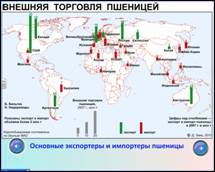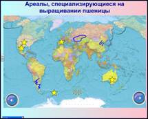 | На карте учитель показывает основные ареалы произрастания пшеницы, используя для этого инструмент ИД «перо». (На этих страницах звездочке задана функция утилиты множественного клонирования, таким образом, учитель показывает страны-лидеры, а ареалы распространения можно показать инструментом «перо», штрихуя или обводя нужный район). | Учащиеся слушают и фиксируют ареалы в контурной карте. |