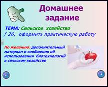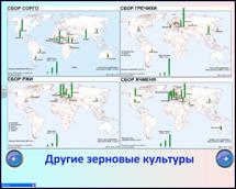 и проверку полученных знаний, решается следующим образом: специализацию сельского хозяйства, уровень товарности, уровень интенсивности производства, основные этапы развития мирового сельского хозяйства и информацию по основным культурам (зерновым) представляет учитель, а изучение остальных культур, ареалов их распространения, страны-лидеры в их производстве ребята выполняют самостоятельно, работая