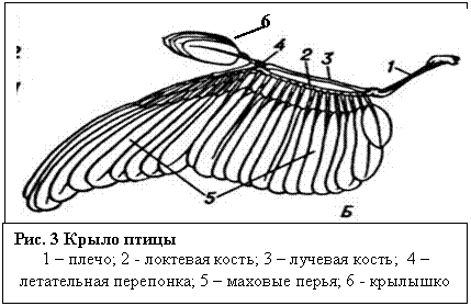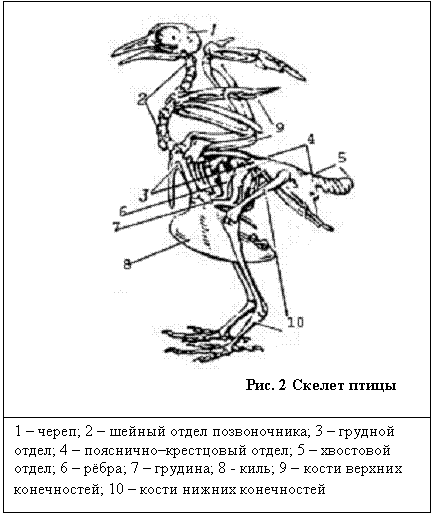 Скелет туловища образует жёсткую конструкцию. Позвоночник имеет 5 отделов: шейный (позвонки соединены подвижно), грудной (позвонки сросшиеся), пояснично – крестцовый отдел или сложный крестец (позвонки срослись), хвостовой (позвонки срослись). Что обеспечивает срастание ряда позвонков скелета птицы? Грудные позвонки и рёбра, соединённые с грудиной образуют грудную клетку. Грудина многих птиц имеет выступ – киль (№8 рис 2)– для закрепления крыловых грудных мышц. К рёбрам прирастают лёгкие. Движение рёбер при полёте автоматически приводит к вентиляции воздуха. Череп облегчён – зубы отсутствуют, роговой клюв. Передняя конечность преобразовано в крыло. На крыле есть крылышко, образованное очень мелкими маховыми пёрышками, сидящими на 1 пальце, играющее важную роль в полёте. Когда при крутых подъёмах под крылом образуются неблагоприятные для полёта завихрения воздуха, птица приподнимает крылышко, пропуская через щель поток воздуха.