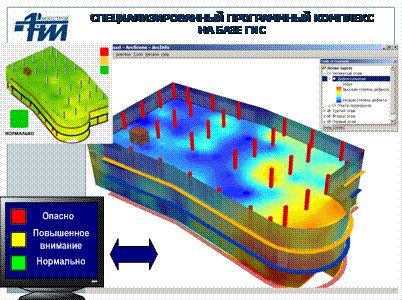Программный комплекс на базе современных геоинформационных систем, для управления системой мониторинга, регулярной проверки работоспособности элементов системы мониторинга, формирования перечня опасных факторов, угрожающих безопасности здания. Программный комплекс должен обеспечивает возможность отображения на трехмерной модели объекта мест и динамики развития дефектов (в том числе и скрытых), и внешних факторов (например, зон образования карстовых явлений под фундаментом зданием) в режиме реального времени. Программный комплекс должен иметь возможность интеграции с системами диспетчеризации и управления инженерным оборудованием объекта, с целью передачи в систему диспетчеризации информации об ухудшении технического состояния объекта в виде простых светофорных сигналов («зеленый» - нормально, «желтый» - повышенное внимание, «красный» - опасно).