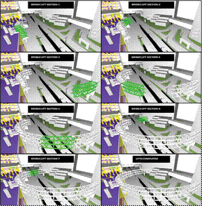Модель была создана для того, чтобы продемонстрировать процесс возведения индивидуальных секций, которые необходимо было поднять над плотным транспортным потоком. Каждую секцию моста (выделенную на рисунке зелёным цветом) можно увидеть в ее конечном положении, а на последнем рисунке – уже всю конструкцию целиком. Рисунки можно дополнить текстом, а затем соединить вместе и в результате получить анимированное видео, демонстрирующее поэтапно весь процесс возведения конструкции. Чёткость, а следовательно, ясное понимание происходящего – это огромный плюс использования 4D моделей также и для собственников проекта.