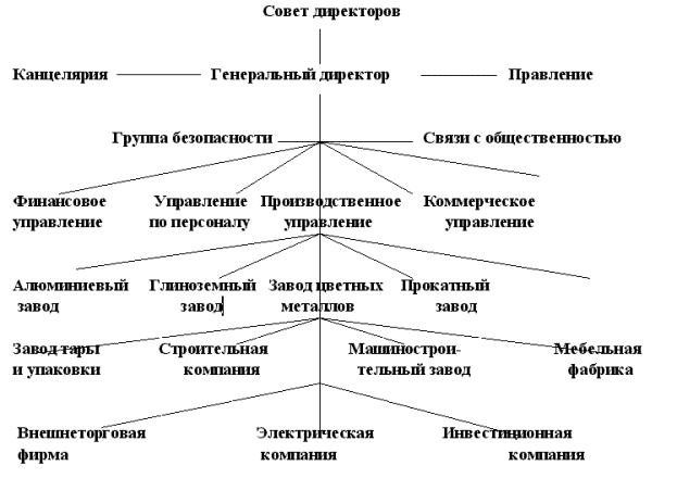 Геннадий Кукарев, генеральный директор металлургической компании, докладывал Совету директоров организационное построение компании. Схема спроектированной им организационной структуры изображена на рис. Один из членов Совета директоров высказал сомнение, целесообразно ли иметь руководителю организации такое большое количество подчиненных, на что Виталий ответил :"Я не верю в теорию, согласно которой руководители должны иметь ограниченное число подчиненных. Это разбазаривает ресурсы и создает бюрократию. Все мои подчиненные – хорошие люди и знают, что они должны делать. В любую минуту они могут обратиться ко мне за помощью в решении любых проблем. Кроме того, я предпочитаю знать из первых рук, как каждый из них работает, указать на ошибки и недостатки немедленно. Почему заведующий секцией в универсальном магазине может иметь в подчинении 25-30 человек, то и я справлюсь. Я полагаю, что вы поставили меня на эту должность для того, чтобы я работал на компанию весь рабочий день"