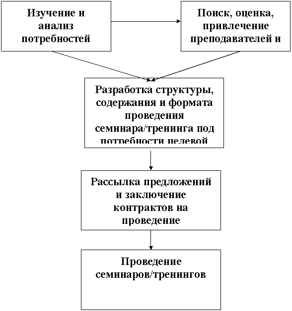 Компания развивает семинар «Бюджетиро-вание и планирование». Не менее 1-го раза в месяц, 120 человек в год для 2007 года и нарастающий коэффи-циент для последующих лет. | Практический аспект семинара | Привлечение консультантов-практиков при формировании структуры и формата программы | ||