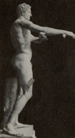 .Лисипп. Апоксиомен. Мраморная римская копия с бронзового греческого оригинала. IV в. до н. э. Рим, Ватикан. | |