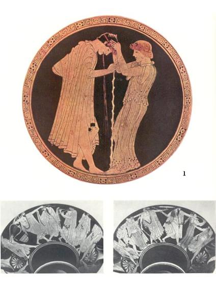 | .Вазописец Брига. Килик «Симпосий». Около 490 г. до н. э. Вюрцбург, Университетский музей: 1 – роспись внутренней стороны килика «Последствия симпосия»; 2, 3 – роспись наружной стороны килика. ПОСЛЕДСТВИЯ ПИРУШКИ |