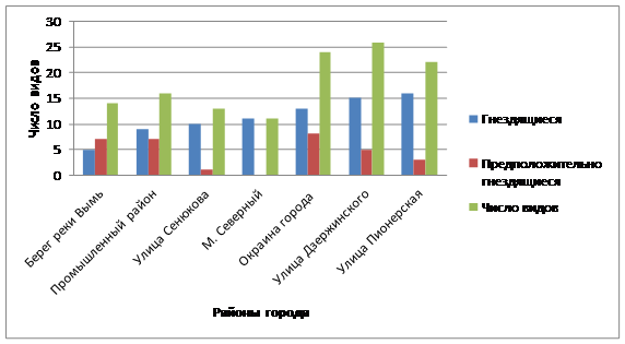 Диаграмма 4. Сравнение численности гнездящихся и предположительно гнездящихся птиц по улицам и районам города Емвы.