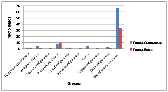 Диаграмма 6. Сравнение численности птиц в отрядах птиц г. Сыктывкара и г. Емва.