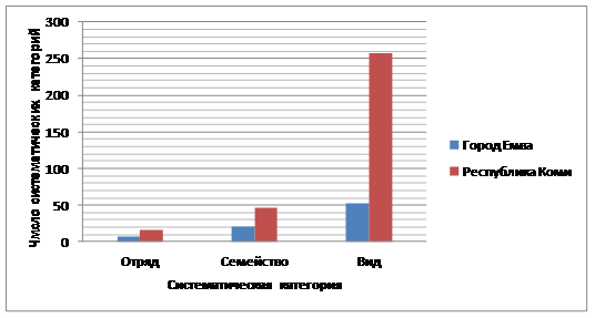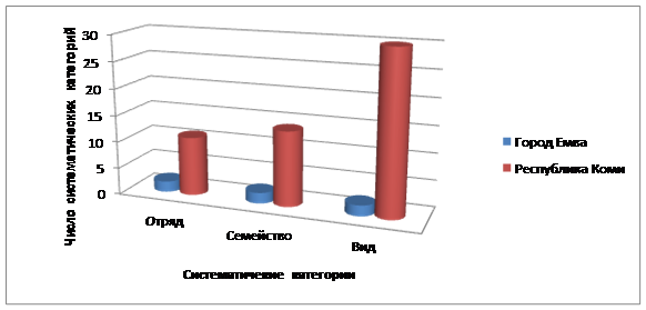 Диаграмма 8. Сравнение числа видов, семейств и отрядов, занесенных в Красную книгу РК с числом видов, семейств и отрядов ,зафиксированных в городе Емва.