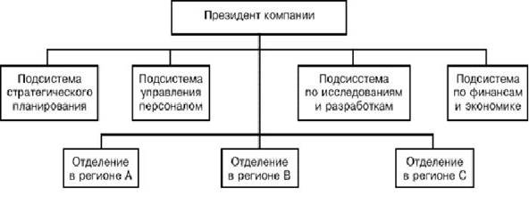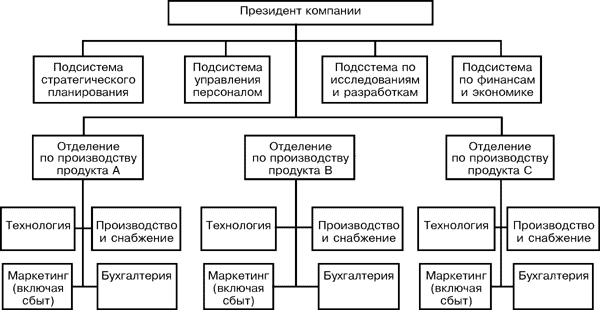 Одним из первых шагов, предпринятых фирмой IBM при создании компьютера среднего класса, завоевавшего значительную долю рынка за рекордно короткое время, был переход на дивизиональную структуру управления. Группы (дивизионы) строились по проектному принципу, а сотрудники компании не закреплялись постоянно за каким-либо конкретным подразделением[6]. По дивизиональному принципу построена структура управления компании 3М, состоящей из 15 дивизионов, а также многих компьютерных фирм, выделяющих в отдельные самостоятельные структурные единицы сервис-центры, отделы сбыта, научные и другие подразделения. Сегодня на Западе классические линейно-функциональные структуры присущи лишь мелким и части средних фирм.