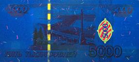 Имитирована путем помещения темной полоски с повторяющимся светлым текстом «5000» между слоями бумаги и напрессовкой фольги на оборотной стороне купюры. Либо через прорези на одном из слоев бумаги (оборотная сторона) продевается цельная полоска, при этом невооруженным взглядом можно увидеть характерные надрезы в бумаге, где проходит полоска, а при сгибе банкноты, в местах выхода полосы наружу наблюдаются отслоения элементов полосы от бумаги.