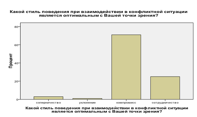 Компромисс, принимаемый участниками конфликтного взаимодействия в качестве основной стратегии поведения, с точки зрения диссертанта, является рациональным действием, поскольку, выбирая для разрешения конфликта именно компромисс, субъекты стремятся получить выгоду и одновременно минимизировать возможные расходы или издержки. Под выгодой в данном случае автором понимается снятие напряженности, позволяющее перейти к конструктивному диалогу, получение дополнительного времени, что дает возможность произвести более детальный анализ ситуации, необходимый для достижения взаимовыгодного результата, собственно разрешение конфликта, являющееся главной целью использования компромисса. К издержкам, связанным с возникновением конфликта, невниманием к его разрешению и как следствие – затяжному характеру противостояния, можно отнести ухудшение взаимоотношений, социально-психологического климата, падение мотивации, снижение эффективности взаимодействия и прочие отрицательные последствия.