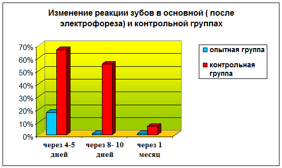 Таким образом, при воздействии электрофореза с помощью препарата «БВ» на препарированные зубы с витальной пульпой, по предложенной нами методике произошло понижение чувствительности тканей зубов к электрическому току в 2 раза.