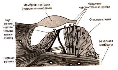 Основная мембрана вблизи овального окна по ширине составляет 0,04 мм, затем по направлению к вершине она постепенно расширяется, достигая у геликотремы 0,5 мм. Над кортиевым органом лежит текториальная (покровная) мембрана соединительнотканного происхождения, один край которой закреплен, второй - свободен. Волоски наружных и внутренних волосковых клеток соприкасаются с текториальной мембраной. При этом изменяется проводимость ионных каналов рецепторных (волосковых) клеток, формируются микрофонный и суммационный рецепторные потенциалы. Образуется и выделяется медиатор ацетилхолин в синаптическую щель рецепторно-афферентного синапса. Все это приводит к возбуждению волокна слухового нерва, к возникновению в нем потенциала действия. Так происходит трансформация энергии звуковых волн в нервный импульс. Каждое волокно слухового нерва имеет кривую частотной настройки, которая называется также частотно-пороговой кривой. Этот показатель характеризует площадь рецептивного поля волокна, которая может быть узкой или широкой. Узкой она бывает при тихих звуках, а при увеличении их интенсивности расширяется.