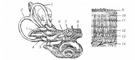 1, 2, 3 - соответственно горизонтальный, фронтальный и сагиттальный полукругом каналы; 4,5 - отолиты аппарат: овальный (4) и круглый (5) мешочки; 6,7 - нервные ганглии, 8 - вестибуло-кохлеарный нерв (Ш ра черепно-мозговых нервов), 9 - отолиты; 10-желеобразная масса, 11 - волоски, 12 - рецепторные волосковые клетки, 13 - опорные клетки, 14 - нервные волокна
