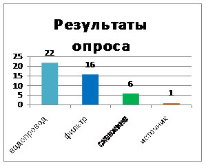 Практическое значение. В работе представлены результаты опытов по оценке качества питьевой воды. Все учащиеся и их родители, преподаватели лицея, участвующие в опросе по потреблению воды и использованию фильтров, были ознакомлены с нашими исследованиями. Работа способствует формированию экологической культуры.