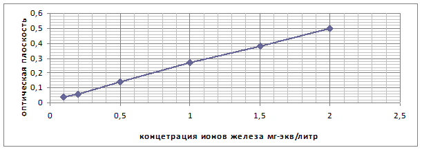 3.Фотометрический метод определения железа. Для определения концентрации железа в пробах воды была построена калибровочная кривая зависимости оптической плотности окрашенных стандартных растворов от их концентраций.