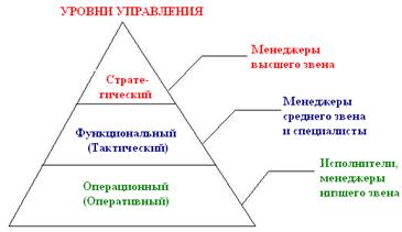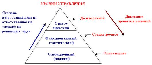 - на верхнем, стратегическом, уровне управления - менеджеры высшего звена руководства организации (фирмы и его заместители), основная их задача - стратегическое планирование деятельности фирмы на рынке и координация внутрифирменной тактики управления;