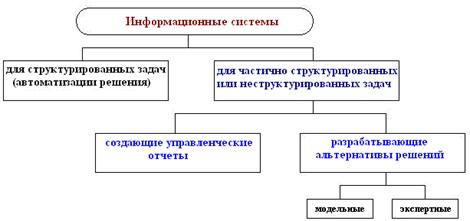 В практике работы любой организации существует сравнительно немного полностью структурированных или совершенно неструктурированных задач. О большинстве задач можно сказать, что известна лишь часть их элементов и связей между ними. Такие задачи называются частично структурированными. В этих условиях можно создать ИС. Получаемая в ней информация анализируется человеком, который будет играть определяющую роль. Такие ИС являются автоматизированными, так как в их функционировании принимает участие человек. ИС, используемые для решения частично структурированных задач, подразделяются на два вида: