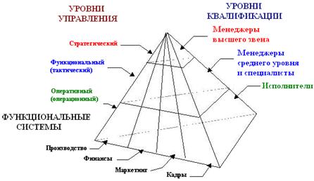 Тип ИС зависит от того чьи интересы она обслуживает и на каком уровне управления. На рисунке 1.6 представлен один из возможных вариантов классификации ИС по функциональному признаку с учетом уровней управления и уровней квалификации персонала.