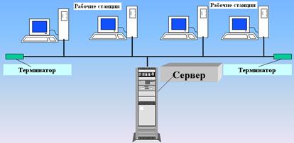 Шинная топология. Построение локальной вычислительной сети по типу «шина» представлено на рисунке 3.3.