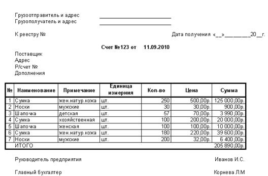 Создайте и заполните бланк товарного счета представленного на рисунке 6.1. Выполните сортировку данных в таблице. Установите требуемые параметры страницы.